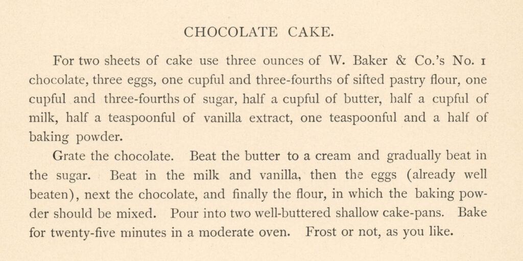 “For two sheets of cake use three ounces of W. Baker & Co.’s No. 1 chocolate, three eggs, one cupful and three-fourths of sifted pastry flour, one cupful and three-fourths of sugar, half a cupful of butter, half a cupful of milk, half a teaspoon of vanilla extract, one teaspoonful and a half of baking powder.