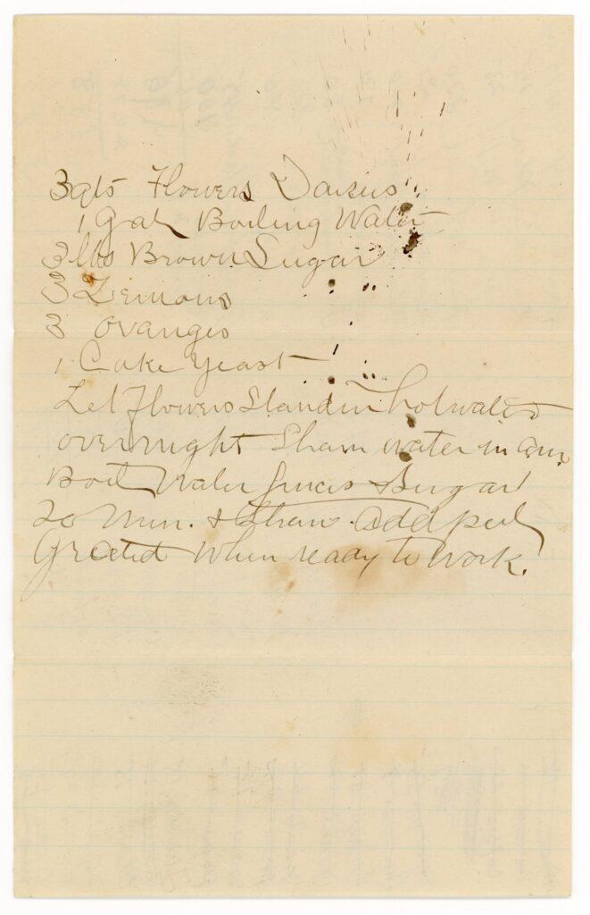 I was able to discover even more documents connected to food thanks to our indefatigable Archives Program Volunteers. One that stood out to me was this undated travel receipt, transcribed by Lori M. Not only does it list several food items (including meat, coffee, bananas, and cake) in the expenses for the trip, but it has a recipe for what looks like a daisy tea with lemon and orange peel on the recto.[3]Please keep in mind that only oxeye daisies are edible, and that people with pollen allergies should avoid consuming them.“Oxeye Daisy”, by Alan Bergo, Forager Chef, June 29, … Continue reading