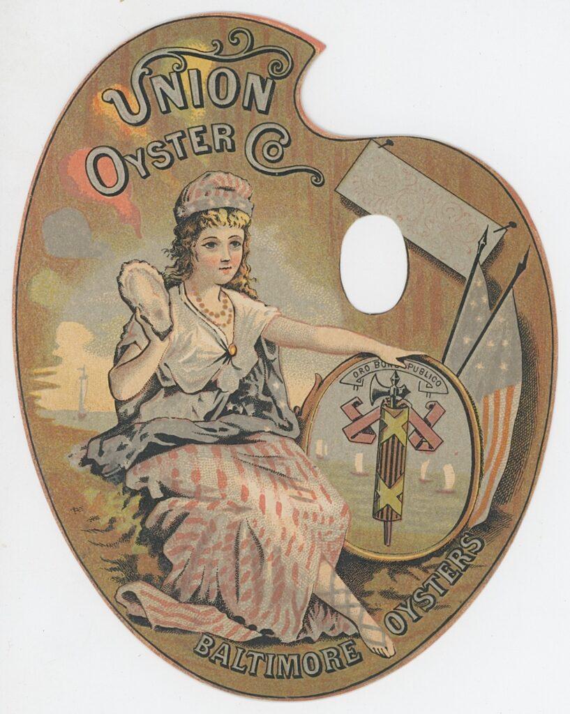 Another type of ephemera stands out, especially for its striking visual appeal: trade cards. These were used to advertise products and services, and were extremely popular in the 19th century. A stunning example of this form of printed ephemera is this trade card for Union Oyster Co. The card is in the shape of a painter’s palette and features a woman dressed in stars and stripes, holding an oyster in her right hand and a shield in her left.