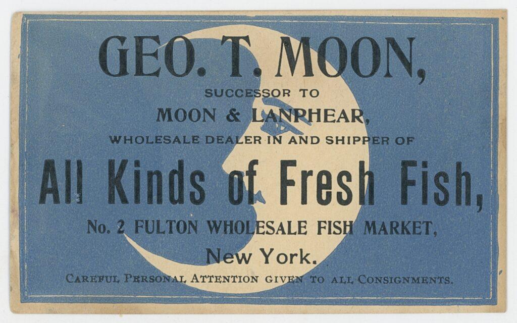Other cards have a more decorative design, with eye-catching colors and illustrations. Some of them depict the products that the business was famous for, like this one for Lockwood & Winant Fish Dealer featuring a drawing of a lobster, a crab, a scallop, and a frog. A crab is also in the center of the card for Century Fish Co., with the lettering reiterating “HARD AND SOFT SHELL CRABS A SPECIALTY.” There are also cards that go beyond the fish motif, like the one for Geo T. Moon Fish Dealer, where the crescent moon is a nod to the owner’s name. Finally, Wallace & Keeney Co. Fish Dealer went for a high-impact design that puts all the focus on color: a bright green highlighting the all-caps text “FISH.”