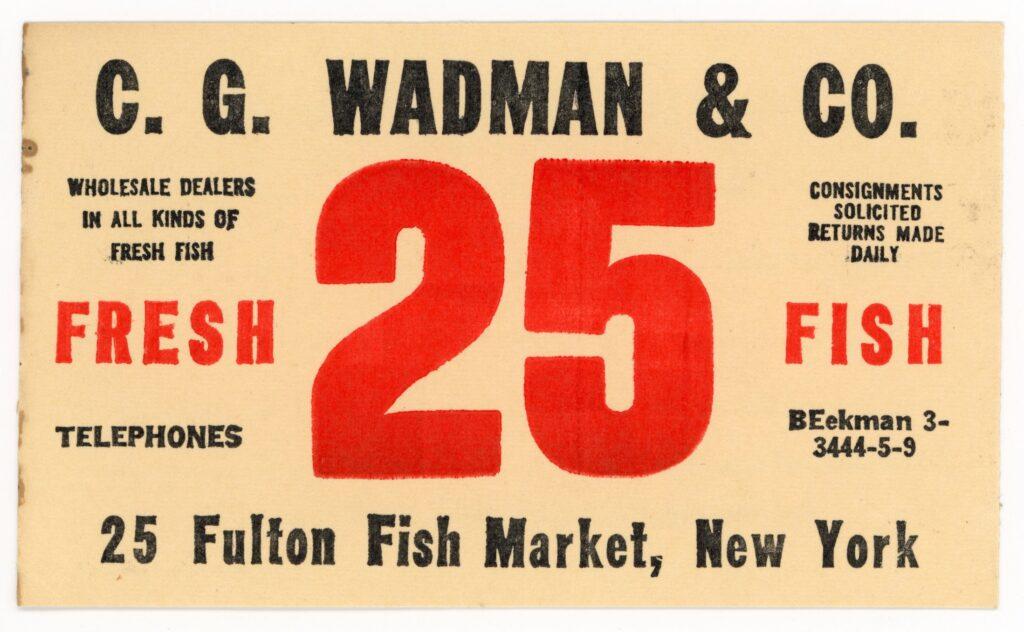 A substantial subset of the Trade Card Collection is related to the Fulton Fish Market. Most of the cards have a very simple, practical design, aimed at conveying all the basic information about a business, like this one from C.G. Wadman & Co.—which also has an order form on the back.
