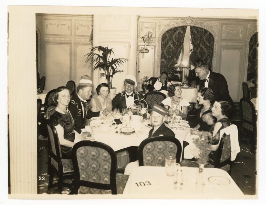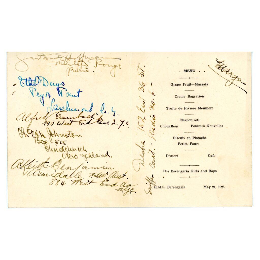 Here is a highlight from the Stanley Lehrer Ocean Liner Collection—paired with a photograph taken on the ocean liner around the same time. The refined Art Deco style of this 1925 menu from RMS Berengaria reflects the elegance of the first-class dining room, with its white tablecloths, fancy upholstery, and stucco decorations. The menu itself is simple, classic French cooking, including Truite Meunière, a pan-fried trout served with lemon, butter, parsley, and toasted almonds. It also has the added treat of being signed by the dinner guests!