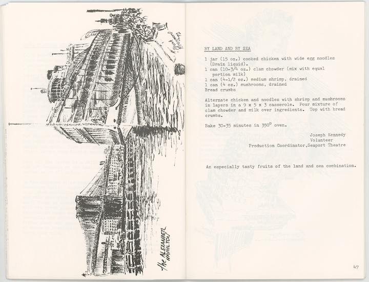 For the lovers of retro recipes, this cookbook is a treasure trove of forgotten foods. Who knew there were so many dishes you could make with canned soup? I thought nothing could surprise me: after all, the green bean casserole (a staple on many Thanksgiving tables) was invented by Dorcas Reilly (1926–2018) of Campbell’s in 1955 to promote their cream of mushroom soup. Then, I read the South Street Seaport Museum Cookbook, which contains recipes for chicken made with canned onion soup, a “tomato soup cake,” and “By Land and by Sea,” a real apotheosis of cooking with canned food, provided by volunteer Joseph Kennedy. The recipe involves layering jarred chicken and noodle soup (drained, of course) with canned clam chowder, canned shrimp, and canned mushrooms; all this, topped with breadcrumbs. Try making this casserole at your own risk—or maybe just admire Frank Braynard’s illustration of the Alexander Hamilton on the other page.