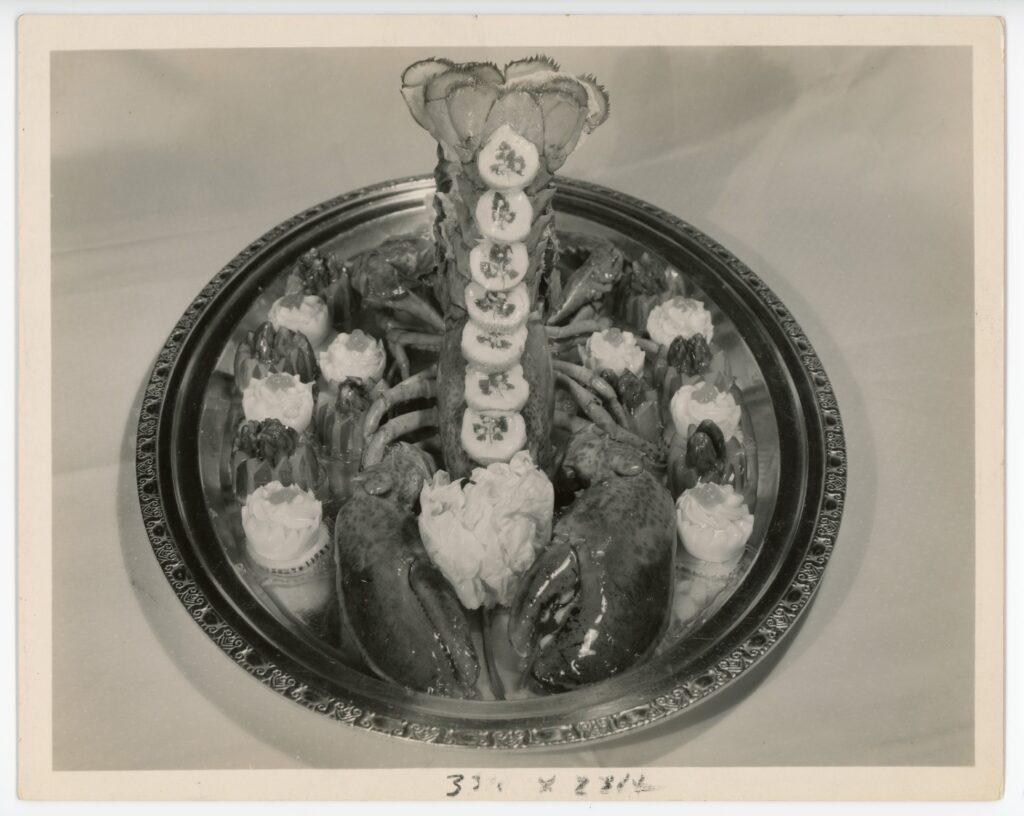 I love a kitsch, maximalist aesthetic—especially when it applies to food. As a fan of Instagram pages like 70s Dinner Party and joys_of_jello (which is curated by culinary historian Sarah Lohman), I was delighted to find professional photographs of dishes served at Teddy’s House of Seafood, located near the Fulton Fish Market. Teddy’s was not only a restaurant, but also a fish packing plant; from these archival images, it looks like at some point in their operation, they tried to elevate the restaurant portion of the business—with a professional photoshoot of their dishes. Behold, a whole fish, tied in twine and surrounded by dumplings (?) covered in spirals of mayonnaise. Or, what’s not to enjoy in the filleted fish covered in alternating slices of tomato and lemon, and decorated with delicate strands of herbs in the shape of vines. And, the masterpiece, a lobster on a plate of deviled eggs and little turrets of pickles and asparagus, topped with even more pickles. All the food is unnaturally shiny, probably covered in a layer of gelatin to make it look glossy, ready for a magazine spread. The effect is surreal—and very amusing when seen with today’s eyes.